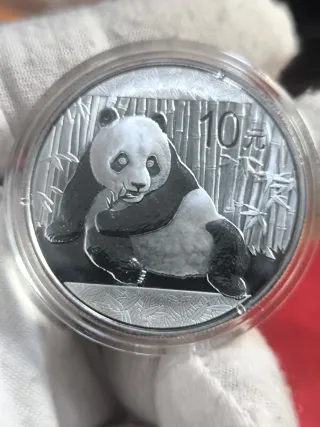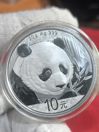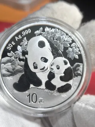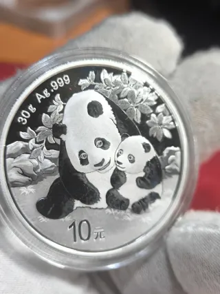 Moneda de plata con diseño de panda. - Peso: 30 gramos. - Pureza: Ag.999. - Valor nominal: 10 Yuan.