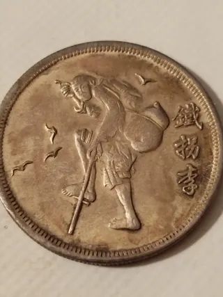 Medalla conmemorativa con diseño oriental. - Representa una figura con un báculo y un hatillo. - Incluye inscripciones en caracteres chinos. - Detalle de pájaros en vuelo.