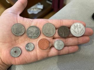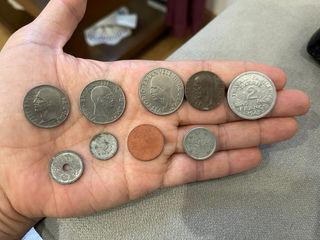 Colección de monedas de diferentes países, de la época de la Segunda Guerra Mundial. - Monedas de Italia. - Moneda de Francia. - Monedas de japon - Moneda de arcilla de la ocupacion japonesa de china.