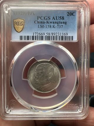 Moneda de plata de China, Kwangtung, con fecha de 1929. - Grado PCGS AU58. - Referencia LM-158 K-737. - Número de certificado: 172669.58/89231169.