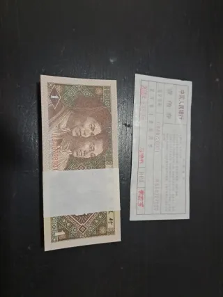 Lote de 100 billetes de 1 Jiao de China, emitidos en 1980. Estos billetes son de la serie SC. Último taco del paquete, con leves señales de las cinchas.