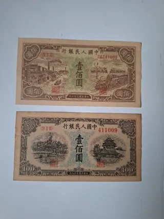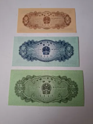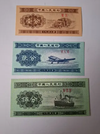 Conjunto de 3 billetes de la República Popular China, emitidos en 1953. Tienen la gran curiosidad de tener impresa su serie en números Romanos. Números Romanos en China?. Es como si nuestros billetes de Euro estuvieran impresos en números Cirilicos, no tendría sentido. - Billetes de 1 fen (color salmón), 2 fen (color azul) y 5 fen (color verde). - Cada billete muestra una ilustración diferente: un camión, un avión y un barco. - Incluyen el texto 中國人民銀行 (Banco Popular de China) y el año 一九五三年 (1953).