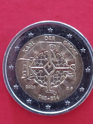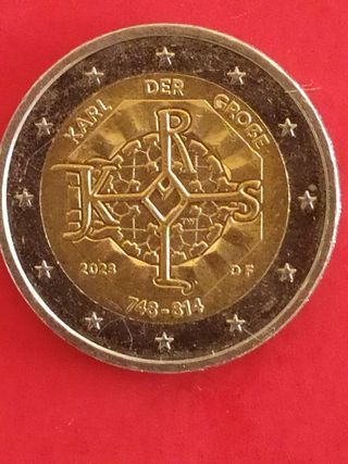 Moneda conmemorativa de 2 euros de Alemania del año 2023. - Diseño de Karl der Große (Carlomagno). - Marca de ceca D y J (Diseñador Janusz Grabianski). - Fecha de emisión: 2023. - Periodo de vida de Carlomagno: 748-814.