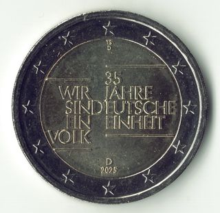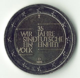 Moneda de 2 euros conmemorativa de Alemania. La moneda es una pieza conmemorativa de 2 euros de Alemania de 2025, emitida para celebrar el 35 aniversario de la reunificación alemana. Letra D