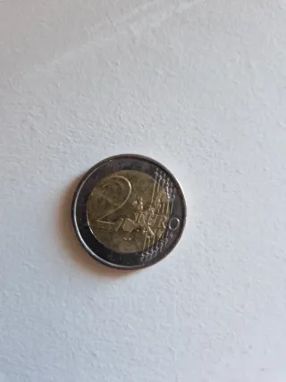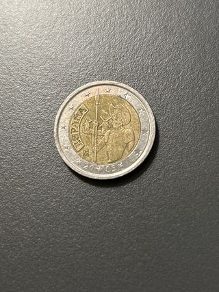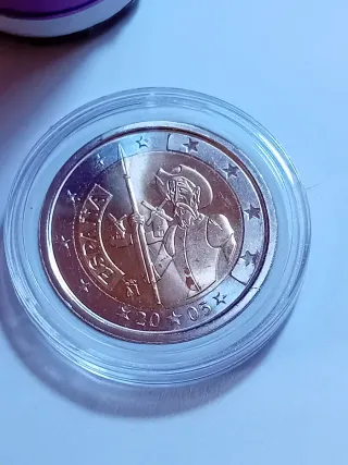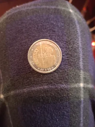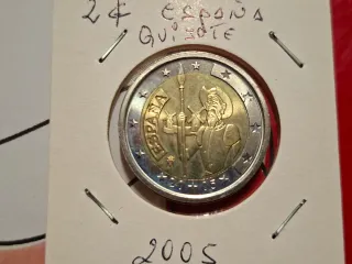 La primera Moneda conmemorativa de 2 euros de España del año 2005, con la imagen de Don Quijote. - Diseño de la serie El ingenioso hidalgo Don Quijote de la Mancha. - Canto con inscripción. - Bimetálica. - Cre sin circular aunque no puedo asugurarlo