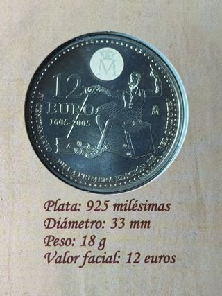 12 EUROS PLATA AÑO 2005. DON QUIJOTE. MUY RARA PLATA 925/1000. PESO 18.00 GR. CONSERVACIÓN SC. INCLUYE MONEDA 2 EUROS CONMEMORATIVA.