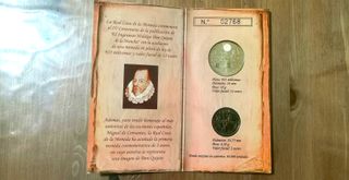 Cartera conmemorativa de la publicación de Don Quijote. - Moneda de plata de ley.+moneda de 2 euros - Valor facial de 12 euros. - Diámetro: 33 mm. - Peso: 18 g. - Tirada máxima en carterita: 30.000 unidades.