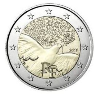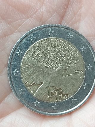 Moneda de 2 euros conmemorativa de Francia de 2015, esta dedicada a los 70 Años de Paz en Europa.