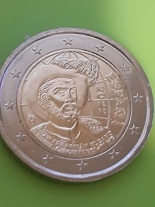 Moneda conmemorativa de España del año 2022. - Conmemora la primera circunnavegación del mundo. - Presenta la imagen de Juan Sebastián Elcano. - Diseño con el mapa del mundo y las fechas 1519-1522.