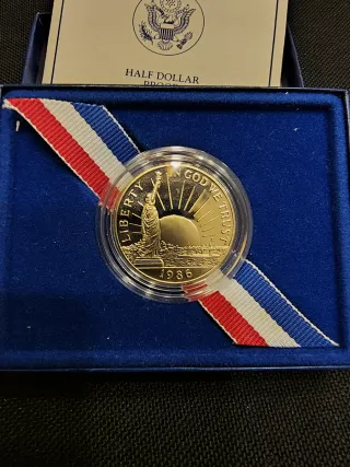 Moneda conmemorativa de Estados Unidos, Half Dollar con la imagen de la Estatua de la Libertad. Impecable en calidad Proof. - Año: 1986 - Diseño: Liberty y In God We Trust - Presentada en estuche azul con cinta tricolor. - Más monedas en mi perfil.