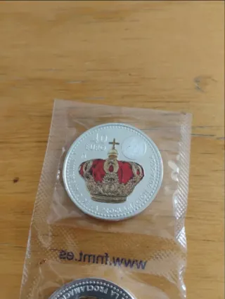 Réplica de una moneda conmemorativa de los Reyes Católicos. - Diseño detallado con las efigies de los monarcas. - Borde con inscripciones. - Acabado dorado.