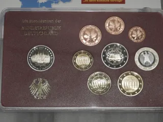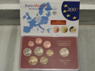 Conjunto de monedas de Euro de la República Federal de Alemania del año 2007, acuñadas en Stuttgart. - Incluye moneda conmemorativa de 2 Euros. - Diseño de la moneda conmemorativa: 50 años de los Tratados de Roma. - Presentado en estuche.
