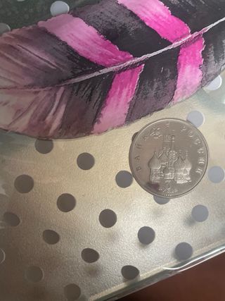 Moneda conmemorativa del Arcángel San Miguel. Encapsulada y con cuatro centímetros de diámetro. Espectacular. No oro, no plata. Precio: 9 euros. - Diseño detallado del Arcángel San Miguel con armadura y alas. - Inscripción THE ARCHANGEL MICHAEL WATCHES OVER US. - Colores vibrantes en las alas y la capa.