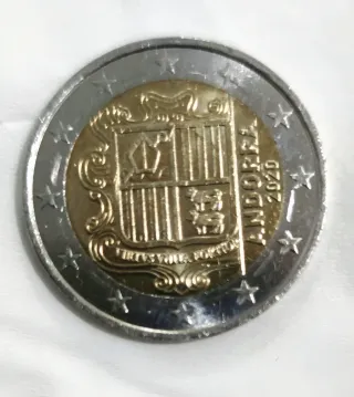 Moneda conmemorativa de 2 euros de Andorra del año 2020. Solo venta por envio excepto si hemos tenido contactos satisfactorios podemos quedar. - Diseño del escudo de Andorra. - Borde exterior con estrellas.