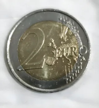 Moneda de 2 euros con diseño conmemorativo. - Borde plateado. - Centro dorado con grabado.