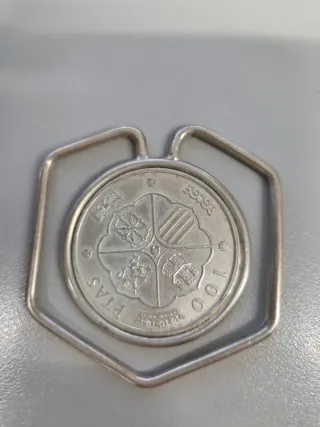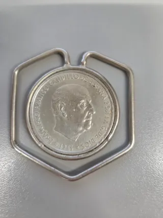Clip para billetes con moneda de 100 pesetas del año 1966. - Moneda conmemorativa de Francisco Franco Caudillo de España. - Año de acuñación: 1966. - Diseño del clip en forma hexagonal.
