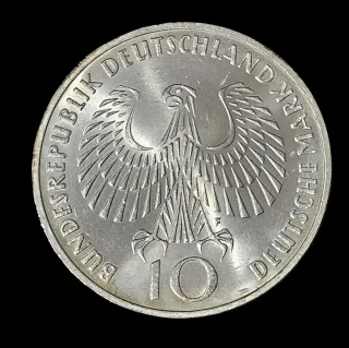 Moneda conmemorativa de 10 Marcos de Plata de Alemania, edición de los Juegos Olímpicos de Múnich 1972. Diseño con los anillos olímpicos y el sol. Hecha de plata 0.625