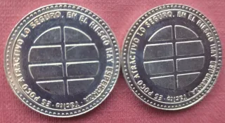 Conjunto de dos medallas conmemorativas. - Diseño circular con borde decorado. - Grabado central con patrón de cuadrícula. - Inscripción en el borde: ATRACTIVO LO SEGURO, EN EL RIESGO HAY ESPERANZA. TACITO ES POCO.