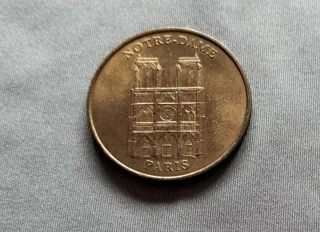 Moneda conmemorativa de Notre Dame en París. Un recuerdo especial de la icónica catedral. Antes del incendio. - Diseño detallado de la fachada. - Inscripción Notre-Dame Paris.