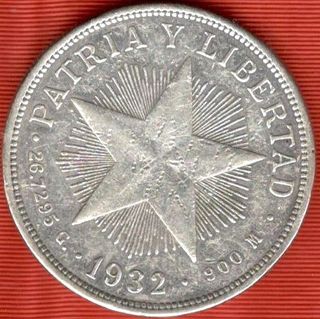 Moneda de Cuba conmemorativa del año 1932. Ley 900 Peso 26,72 gr Conservación Buena - Diseño con estrella central. - Inscripción Patria y Libertad. - Detalles 26.7295 y 900 MILESIMAS