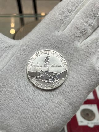 Moneda de plata conmemorativa de los Juegos Olímpicos de Atlanta 1996. plata 900 mm 26’8 grm - Diseño de la antorcha olímpica y apretón de manos. - Valor nominal de un dólar. - Acuñada en plata.
