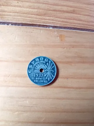 Moneda española conmemorativa del año 1937. - Diseño con el yugo y las flechas. - Inscripción 1937 II AÑO TRIUNFAL.