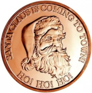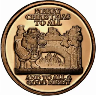 Moneda conmemorativa de cobre 999 con diseño de Santa Claus junto a una chimenea. ENCAPSULADA - Diseño de Santa Claus y chimenea. - Acabado en cobre 999. - Peso de 1 Onza AVDP.