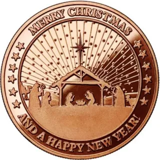 ONZA AVDP conmemorativa de cobre con diseño de Belén y Navidad. ENCAPSULADA - Representación de la Natividad con figuras y estrella. - Inscripción Merry Christmas and a Happy New Year. - Borde decorado con estrellas.
