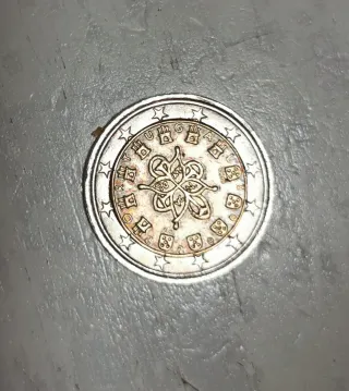 Moneda de 2 euros conmemorativa de Portugal. Con error de acuñación en las estrellas - Diseño bimetálico. - Canto con inscripciones.