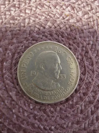 Moneda conmemorativa de la República Dominicana. - Regalo chele o centavo de palmita. - Un Peso en el anverso. - 25 Aniversario de la Era de Trujillo en el reverso. - Año 1955. - 26.7 gramos.Ag.900 milésimas. - Moneda difícil de encontrar porque a la muerte del dictador fundieron 50.000