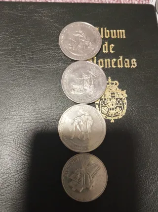 Conjunto de cuatro monedas conmemorativas del Quinto Centenario de la llegada de Colón a América. - Cupro níquel (no son de plata). - Monedas de la República Dominicana. - Diseño conmemorativo del Quinto Centenario. - Incluye imágenes de barcos y monumentos históricos.