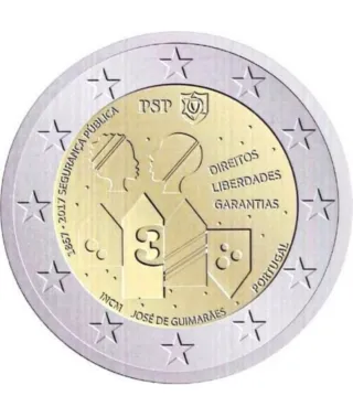 Moneda conmemorativa de 2 euros dedicada a la Policía Nacional. - Conmemora el bicentenario de la Policía Nacional (1824-2024). - Diseño con el escudo de la Policía Nacional y la inscripción ESPAÑA. - Borde exterior con estrellas de la Unión Europea.