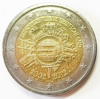 Moneda de 2 euros conmemorativa de Bremen, Alemania, acuñada en 2010. - Diseño del edificio histórico de Bremen. - Borde exterior plateado y centro dorado. - Inscripción BREMEN y año 2010.