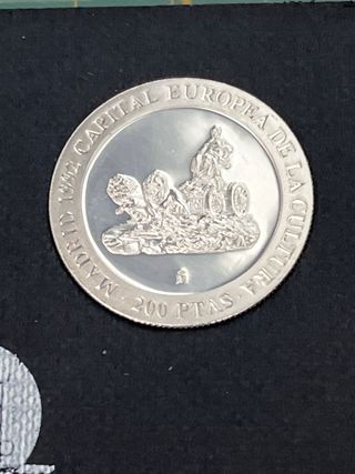 Moneda conmemorativa de 200 Pesetas de plata, acuñada en Madrid en 1992. - Conmemora Madrid como Capital Europea de la Cultura. - Diseño con carroza y figura. - Canto con inscripción MADRID 1992 CAPITAL EUROPEA DE LA CULTURA 200 PTAS.