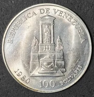 Moneda conmemorativa del 150 aniversario de la muerte de Simón Bolívar - País: República de Venezuela - Año: 1980 - Peso: 22 gramos de plata (ley 900) - Valor facial: 100 bolívares