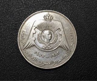 Moneda conmemorativa 25 Aniv. Ascensión al trono del rey Hussein ¼ dinar, Año 1397 (1977) - ١٣٩٧ Período Reino Hachemita de Jordania (1949 - 1991) Cuproniquel 17gr, 34mm, grosor 2,3mm