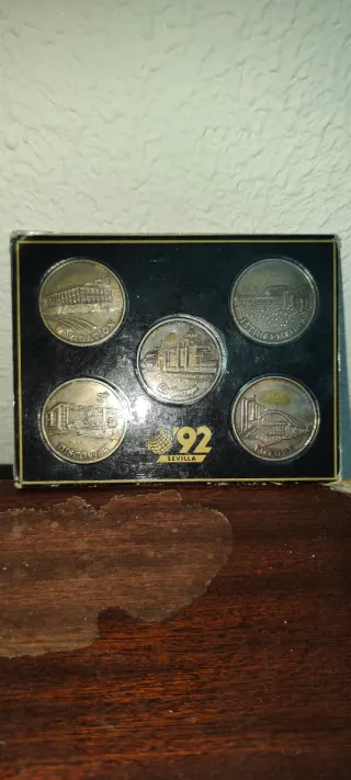 Conjunto de 5 monedas conmemorativas de la Expo de Sevilla 1992. - Diseño conmemorativo del evento. - Cada moneda presenta el año '1992'.