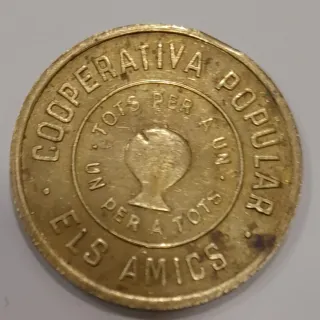 Moneda conmemorativa de 10 céntimos de la Cooperativa Els Amics. -De la poblacion de Terrassa. Barcelona -Anterior a guerra civil. - Año de acuñación: 1935. -Se envia la moneda de la foto