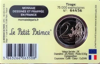 Moneda conmemorativa de 2 euros dedicada a El Principito. - Diseño especial con la figura del Principito. - Año de acuñación: 2026. - Motivo: El Principito.