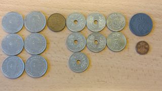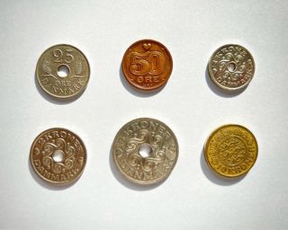 Conjunto de monedas danesas de diferentes valores. Dime cuánto pagarías por ellas. - 10 Kroner: 28 mm, 12,5 g, cobre 750, níquel 250. - 5 Kroner: 33 mm, 15,0 g, cobre 750, níquel 250. - 1 Krone: 25,5 mm, 6,8 g, cobre 750, níquel 250. - 25 Øre: 23 mm, 4,3 g, cobre 750, níquel 250. - 10 Øre: 18 mm, 3,0 g, cobre 750, níquel 250. - 5 Øre: 15,5 mm, 1,6 g, cobreplateret jern.