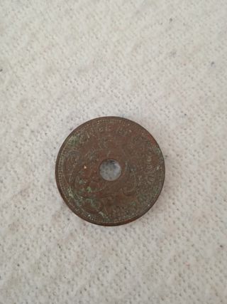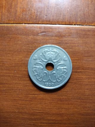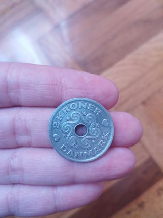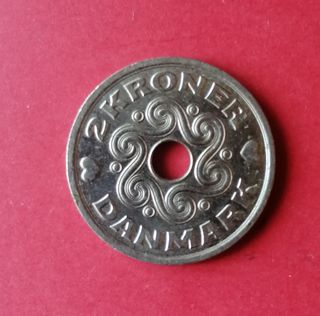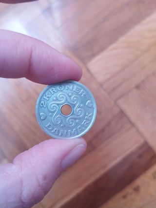 Moneda de 5 coronas danesas. - Diseño con agujero central. - Inscripción DANMARK en el reverso.