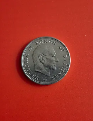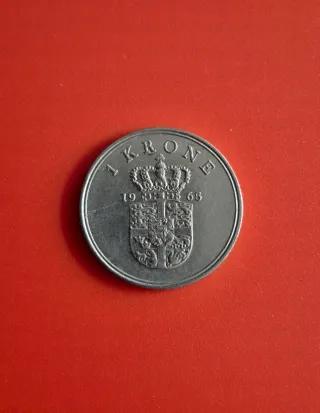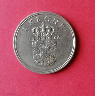 Moneda de 1 Corona Danesa del año 1965. Presenta el retrato del rey Federico IX. - Anverso: Federico IX, Rey de Dinamarca. - Reverso: Denominación y año.