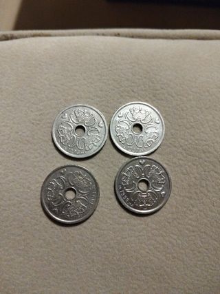 Conjunto de cuatro monedas danesas. - Dos monedas de 50 Øre. - Dos monedas de 25 Øre. - Diseño con un corazón y el valor. - Acabado en bronce.
