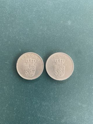 Se venden dos monedas danesas de 1 Krone del año 1965. Están en buen estado. - Monedas de colección. - Acuñadas en 1965. - Representan la corona danesa Federik | X. y otra ygual din año 1964