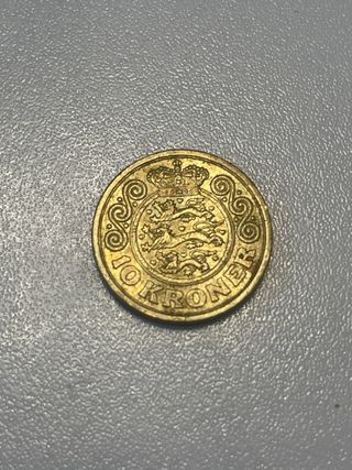 Se ofrece moneda danesa de 10 coronas de 1989. Es una moneda antigua, con señales de uso visibles. - Moneda de 10 coronas danesas. - Presenta desgaste por el paso del tiempo.