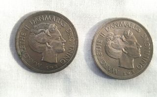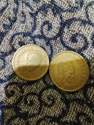 Monedas antiguas de 5 coronas danesas de 1977. Se encuentran en buen estado de conservación. - Moneda de 5 coronas danesas. - Año de acuñación: 1977. - Muestra el retrato de la reina Margarita II y el escudo de armas de Dinamarca. Escucho Ofeetas