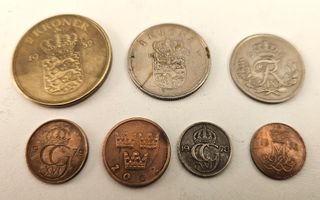 Conjunto de monedas danesas. -tres monedasde 1 Corona de 1976. - dos monedas de 25 Øre de 1976 - Una moneda de 5 Øre de 1990. - Una moneda de 1 Corona de 1992