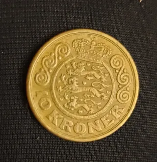 Moneda de 10 coronas danesas con un diseño detallado. - Diseño de escudo con leones y corona. - Inscripción 10 Kroner.