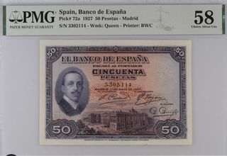 Precioso billete de 50 pesetas españolas de 1927, en excelente estado de conservación. - Billete del Banco de España. - Serie 3302114. - Marca de agua: Reina. - Impresor: BWC. - Calificación PMG: 58 (Choice About Unc)