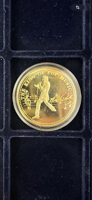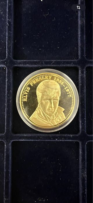 Moneda conmemorativa de Elvis Presley, con un acabado de chapado en oro de 24 quilates. Diámetro 37mm y peso 30gr. Con cápsula de protección.